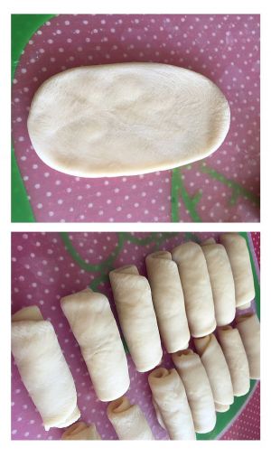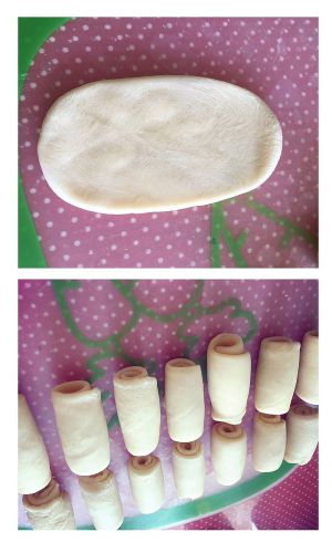 将面卷对折,擀开。放入红豆沙馅包紧,封口朝下按扁