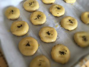 表面划两个口子,刷一层蛋黄液,撒些黑芝麻。同时烤箱预热180℃