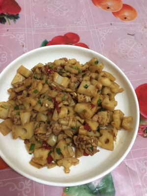 热锅下油,然后下蒜末姜末酸辣椒煸炒,再将肉末下锅煸炒,(可自行调节是否放肉末)最后下藕丁煸炒几分钟然后加盐酱油调味,最后放入葱花即可……起锅啦……