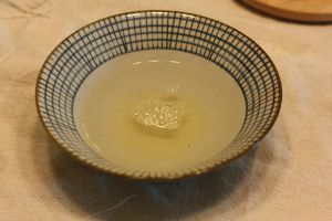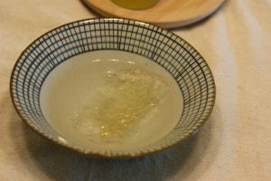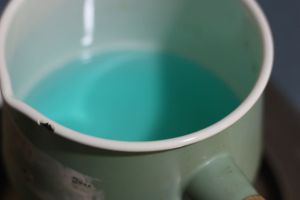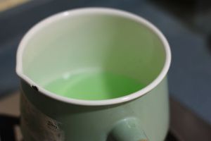 当蓝色鸡尾酒果冻凝结后,把青柠味鸡尾酒倒入小锅中,重复第4步到第6步