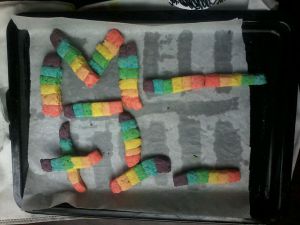 把小面团搓成小条,按彩虹的颜色摆好后,压一下,切好
