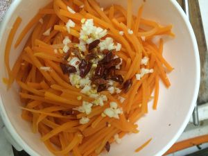 后放入蒜末,干辣椒(买整个的干辣椒用剪刀剪碎)