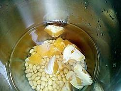 4.豆浆机中,加入泡好的黄豆、利赠商城橙子、加水至1300ML。