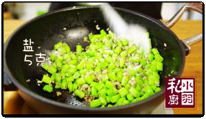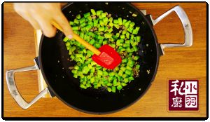 ▲再把切好的四季豆倒入锅里,继续翻炒,炒到四季豆的颜色变深。
