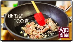 ▲锅里倒油,烧热之后放入100克的猪肉馅翻炒,看到肉馅全部变色了,就是炒好了。