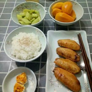 鸡翅烤好后黄瓜也已经入味,配上蛋黄和米饭,开吃