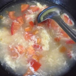 关火,汤勺沿固定方向转动,并缓慢倒入蛋液。