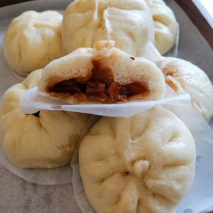 接下来发面团,将面粉和酵母粉、泡打粉、白糖、玉米油、牛奶、温水一起和面,然后将面揉至光滑,发面约30分钟,再搓成长条,分成等量的小面团,然后再擀成包子皮,将冰箱的肉馅取出,把它包起来。