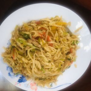 将面条盖在配菜上,中小火焖1分钟,改大火炒匀
