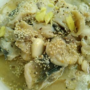 鱼骨和鱼肉分开装,分开腌制,用盐,料酒,生粉(湿),生抽,胡椒粉腌制15分钟入味。