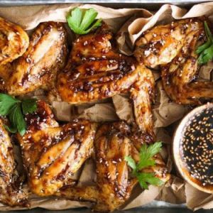 把烤箱的鸡翅取出,淋上酱汁,涂抹均匀,再次放入烤箱,烤5分钟左右