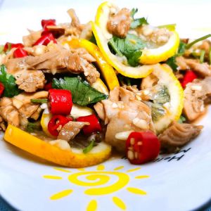 鸡腿撕成丝,加柠檬片,小米辣,香菜,蒜末,四勺生抽,三勺醋,一勺蚝油,搅拌均匀。