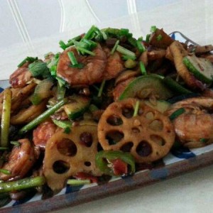 第三,放油把姜蒜泥,辣椒,酱油,豆瓣酱,盐,熟了的蔬菜和虾放一起炒,入味即可,起锅时放入香葱和香菜
