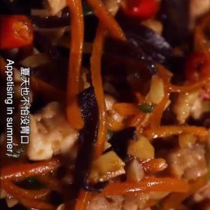 起锅烧油至油热,放入猪肉翻炒几下,放入葱姜辣椒酱等辅料,翻炒至入味,倒入胡萝卜香菇等,翻炒5分钟,放入盐,生抽,醋适量即可。