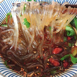 煮好的粉条和小青菜捞入碗中,兑点煮粉的汤,撒上花生米,喜欢吃香菜的也可以撒点香菜