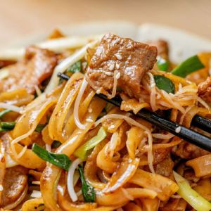 锅内下入河粉,先用筷子将河粉拨开拨散,再用锅铲将河粉翻面,将河粉煎至两面焦香