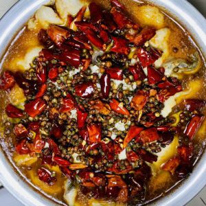 放入备好的花椒,麻椒和干辣椒,控制好油温,别让干辣椒花椒麻椒糊了