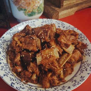 加生抽、老抽、冰糖、盐、排骨汤,大火烧开后转中火。