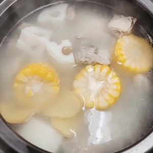 玉米和莲藕洗净,玉米切成段,莲藕切块。排骨冲洗干净,冷水下锅,放入姜片