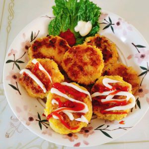 依次沾面粉,鸡蛋液,面包糠。成如图状。