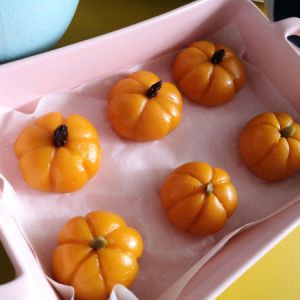 用牙签压出南瓜的形状,顶部放一粒葡萄干或者南瓜子