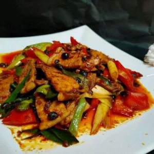 放豆豉炒香,再放入肉片,青蒜翻炒。
