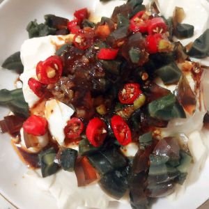 皮蛋剥皮,内酯豆腐,放入碗中,请忽略豆腐碎掉了。