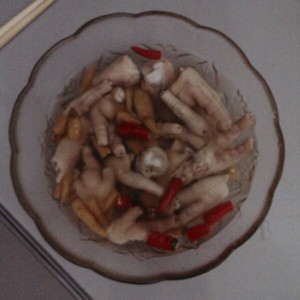 将烧好的鸡爪盛出,反复用凉水冲洗,去掉油脂。放在一边把水控干。