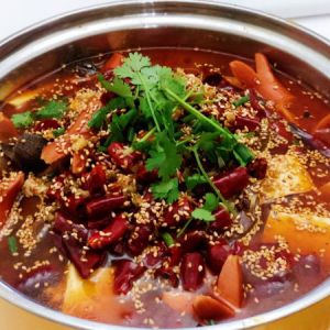 菜煮熟之后放入大碗中,再煮豆腐、鸭血,最后煮毛肚脆皮肠,煮好后放入碗中,将锅中煮菜的汤倒入大碗中,重口味的话上面可以撒点儿辣椒粉