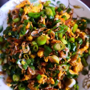 将蛋松虾皮盛出至大碗,加入香葱丁,加蚝油生抽或味极鲜,少许香(米)醋,调匀。