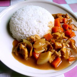 米饭盛到碗中倒扣在盘中,浇上咖喱鸡酱,一道美味的咖喱鸡饭就