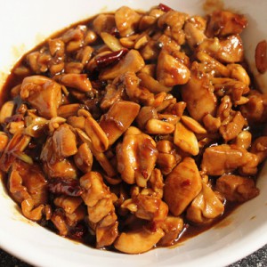 加入鸡肉翻炒均匀后,沿锅边倒入宫保汁