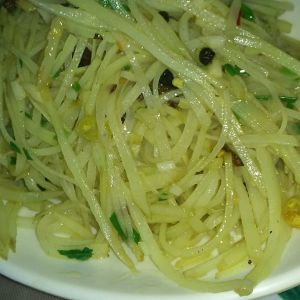 土豆切成大小均匀的细丝,并在清水中过下水,