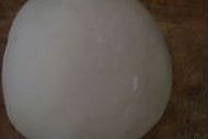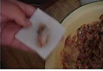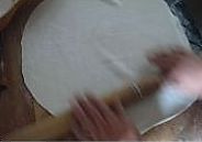 拿起一块饺皮用筷子抹上一块馅在正中间,