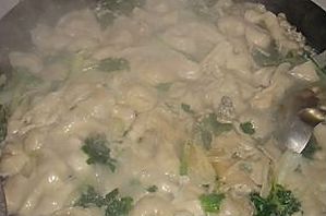 锅内倒油,放入青菜炒好加水,水开后放入包好的猫耳饺子,