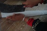 如图所示将面皮卷在擀面杖上,用刀在上面划上一刀,皮脱离擀面杖