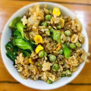 把隔夜的炒青菜和玉米青豆倒入,翻炒片刻,别问我为什么这步要比饭后倒入,因为本来就是熟的,过早就太老了,老到你不想次