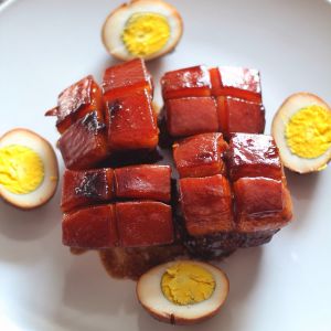 起锅,五花肉摆盘,淋上少许汤汁,鸡蛋切开摆放在肉块周围(也可整蛋装盘)