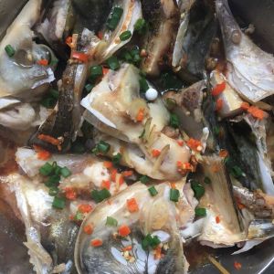 然后把小辣椒、姜、葱+所有调味料倒到鱼头拌匀腌制5分钟,把开水烧沸腾放入鱼头盖上盖子。