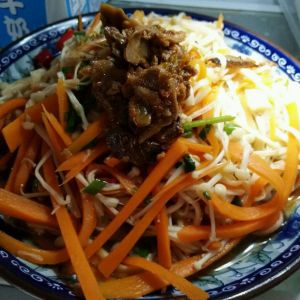 碗里调入盐,蒜米,小米辣,酱油,醋,白糖,香油,葱花,把胡萝卜金针菇加入伴匀即可