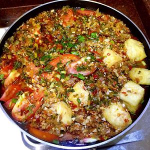 鱼煎好后拿走,锅里放上剩下的葱段,香菜段,蒜蓉,姜蓉,洋葱片,西红柿,油炸豆腐。