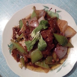 放入青椒,洋葱。生抽,盐要适量,因为乳腐里有盐,加入红酒,鸡精,撒葱花即可