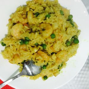在水量略少时,放入米饭,快速翻炒,让咖喱尽满米饭