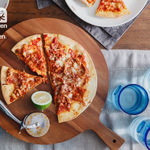 在饼底上涂抹一层披萨酱,撒一层马苏里拉芝士,再抹一层酱,再撒一层芝士,最后撒橄榄油、黑胡椒,入烤箱上层220度烘烤十分钟。