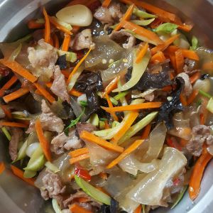 油烧热后,倒入少许味极鲜,放入蒜瓣,干辣椒丝,木耳,拉皮,放入小米醋,食盐,蚝油,香油。最后快出锅后放入黄瓜丝和胡萝卜丝继续翻炒下。如果喜欢吃香菜可以放在香菜在锅里
