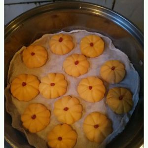 这个步骤忘记拍照了,不过我会说得很详细的,取适量南瓜团捏圆(就跟手工汤圆一样的)然后用牙签或者烧烤签,只是说烧烤签好用一点长一些,模仿南瓜的样子在捏好的南瓜团压好纹路,最后在中间放颗枸杞就好啦!