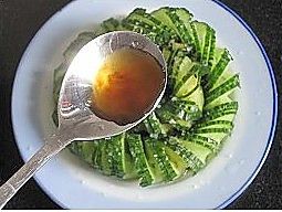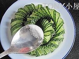 把切好的黄瓜放入碗里,加少许盐,均匀撒在黄瓜表面,腌制20分钟;把腌制后的水倒掉;