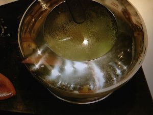 内部发软后,盛入容器内,加入碱水,发至原体积的2~3 倍时,捞起放入清水中,反复漂洗,去净碱味;
