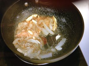 炒锅再上火,舀入鸡清汤250毫升,放入蹄筋、火腿片、虾子、熟猪油75 克,烧至蹄筋软糯;