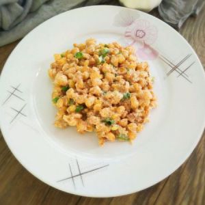 热锅下适量的油放压碎咸蛋炒至起泡,放炸过的玉米粒快速翻炒放椒盐、葱花拌均匀即可出锅。